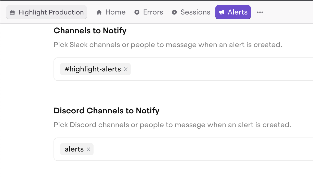 Once you do this, you will see an option to add discord channels on any of the alerts found at https://app.highlight.io/alerts. It'll look like this: